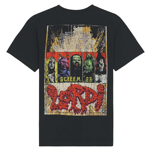 Frontdruck: Gesichter der Bandmitglieder in blutiger Optik + "Lordi" Aufschrift, farbig, vollflächig